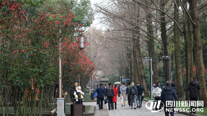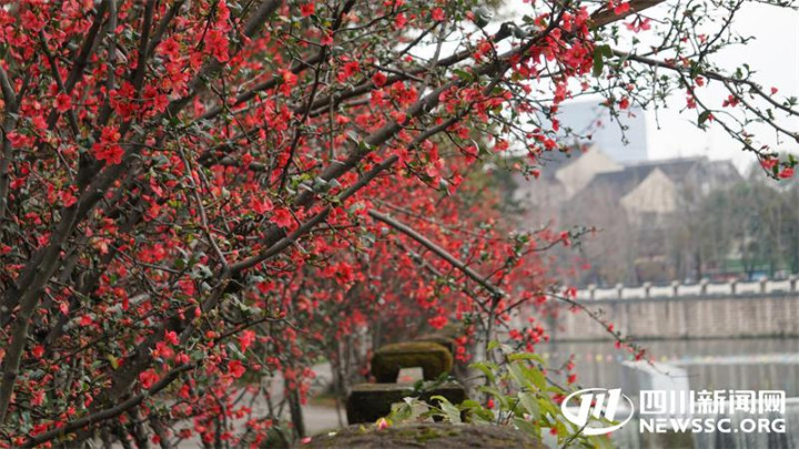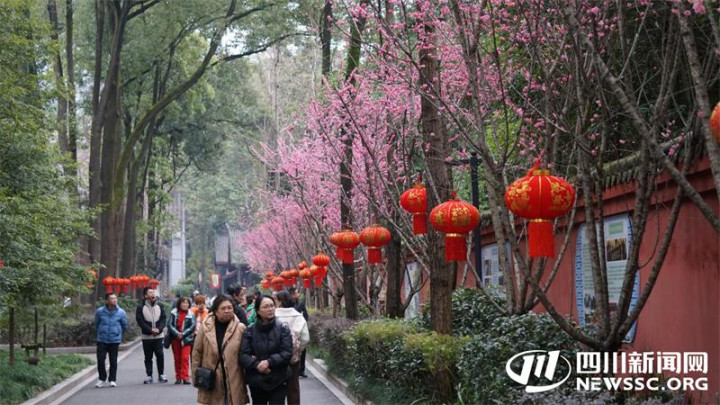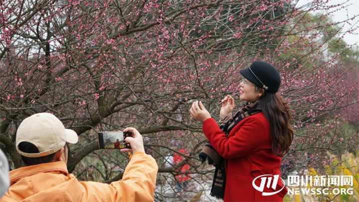 走进位于浣花溪南岸的百花潭公园,只见一片片俏丽的红梅沿河岸盛放,梅枝肆意舒展,艳红的花朵缀满枝头,暗香浮动、摇曳生姿。园内绿植葱郁、树林连绵,亭台小榭、飞瀑直下,不少市民游客静坐林下品茶休憩,赏梅之绚烂。